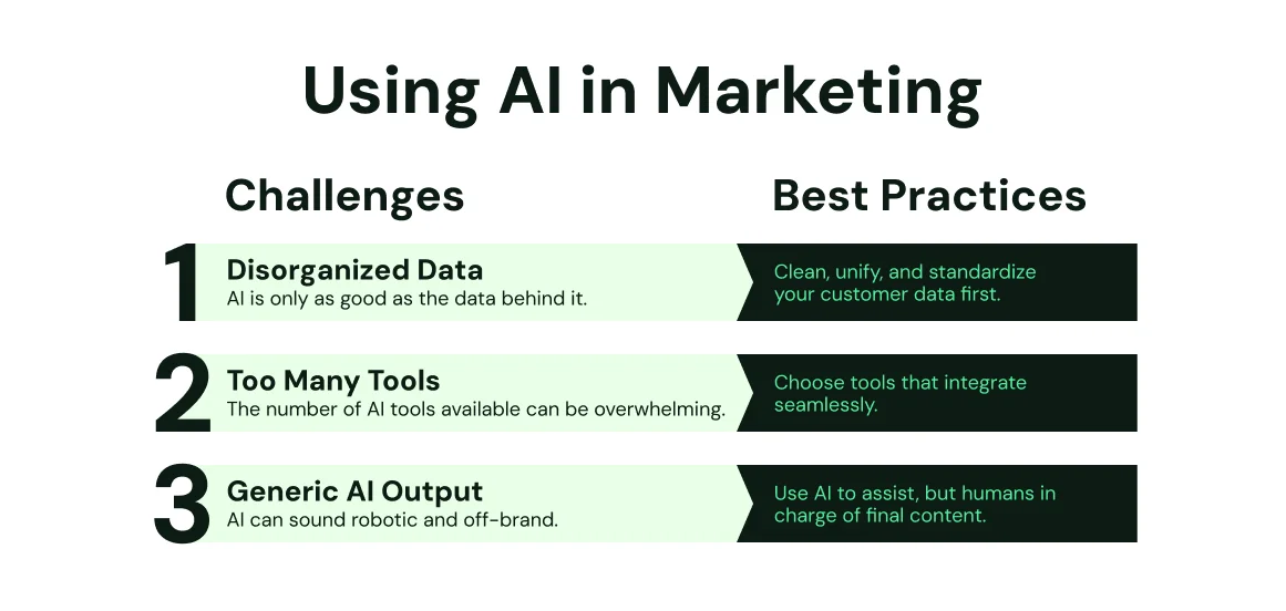 Messy and Siloed Data: Let’s be blunt: AI is only as smart as the data you feed it. The biggest challenge for many teams is a customer database that is disorganized, incomplete, and spread across multiple systems. If your data is a mess, your AI will produce messy results.